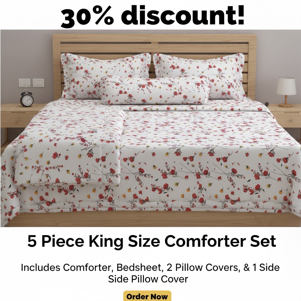১০০% সুতি কাপরের ইটালিয়ান ফাইভারের কম্ফর্টার। এটা ৫ পিসের একটি সেট। এখানে আপনি পাবেন একটি কিং সাইজ কম্ফর্টার (৮\৭ ফিট) একটি বিছানার চাদর ৮/৭ ফিট? , ২ পিস বড় সাইজের বালিশের কাভার, একটি বড় সাইজের কোলবালিশ কাভার। আর এই সেটটির মুল্য ১৭৯০ টাকা + ডেলিভারি চার্জ ঢাকার বাইরে ১৫০ টাকা আর ঢাকা সিটির মধ্যে ৮০ টাকা
