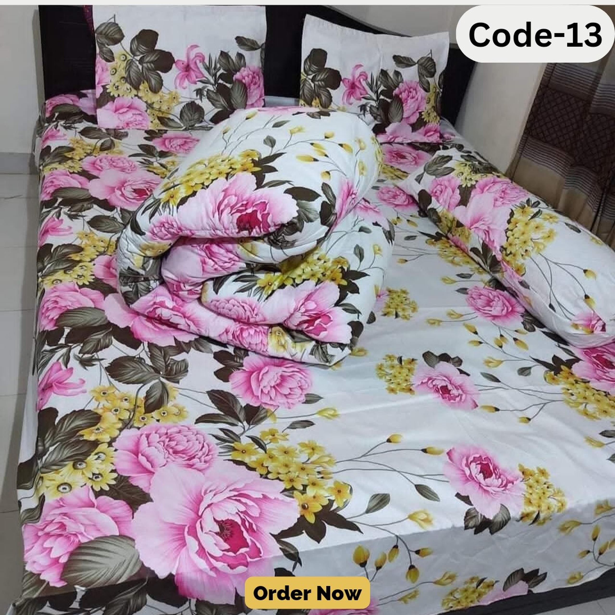৭/৮ ফিট কমফোর্টার একটি,বালিশের কভার২টি কোল বালিশের কভার ১টি ও বিছানার চাদর সহ ৫পিচের কম্বো সেট। বিঃ দ্রঃ যারা কম্বো সেট নিবেন তারা পাবেন।